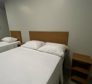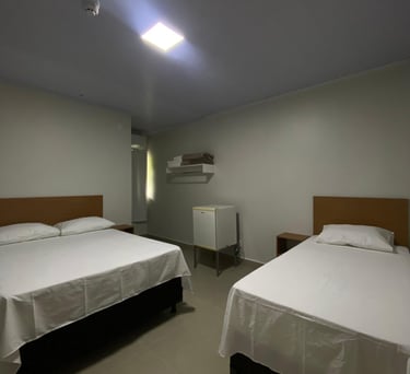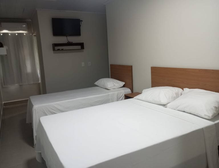 O quarto standard oferece conforto com ar-condicionado, TV e frigobar, uma cama casal e uma solteiro ideal para viajantes que buscam praticidade e aconchego.