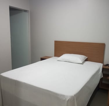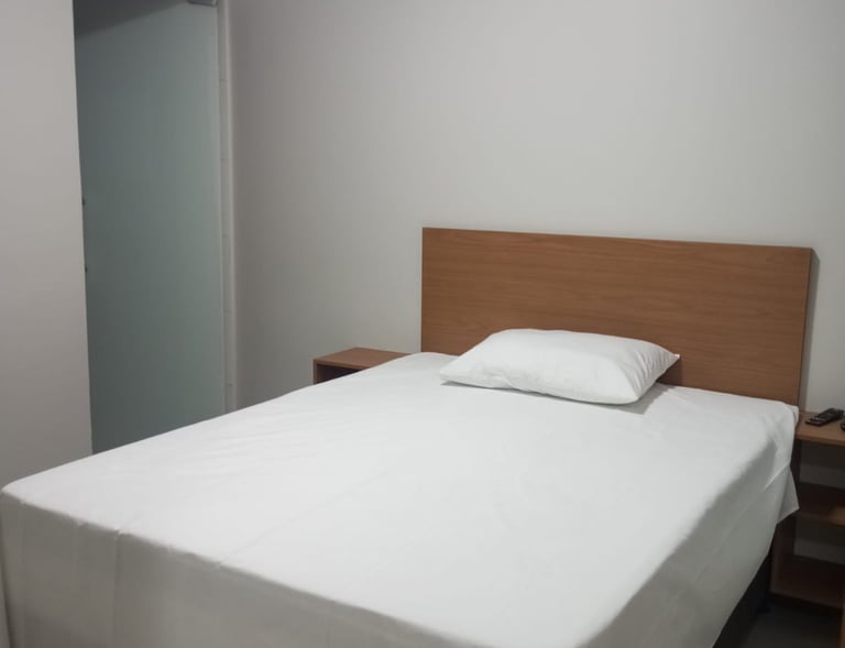 O quarto solteiro oferece conforto com ar-condicionado, TV e frigobar, ideal para viajantes que buscam praticidade e aconchego.