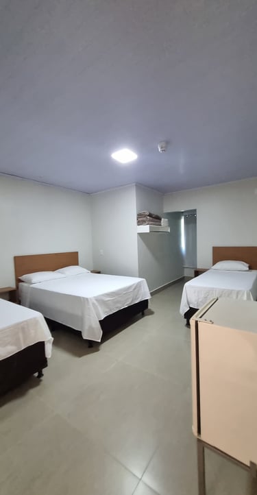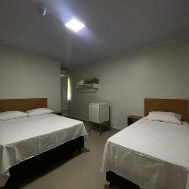O quarto Familia oferece conforto com ar-condicionado, TV e frigobar, uma cama casal e duas solteiro, proporciona uma experiência com todas as comodidades para uma estadia relaxante.